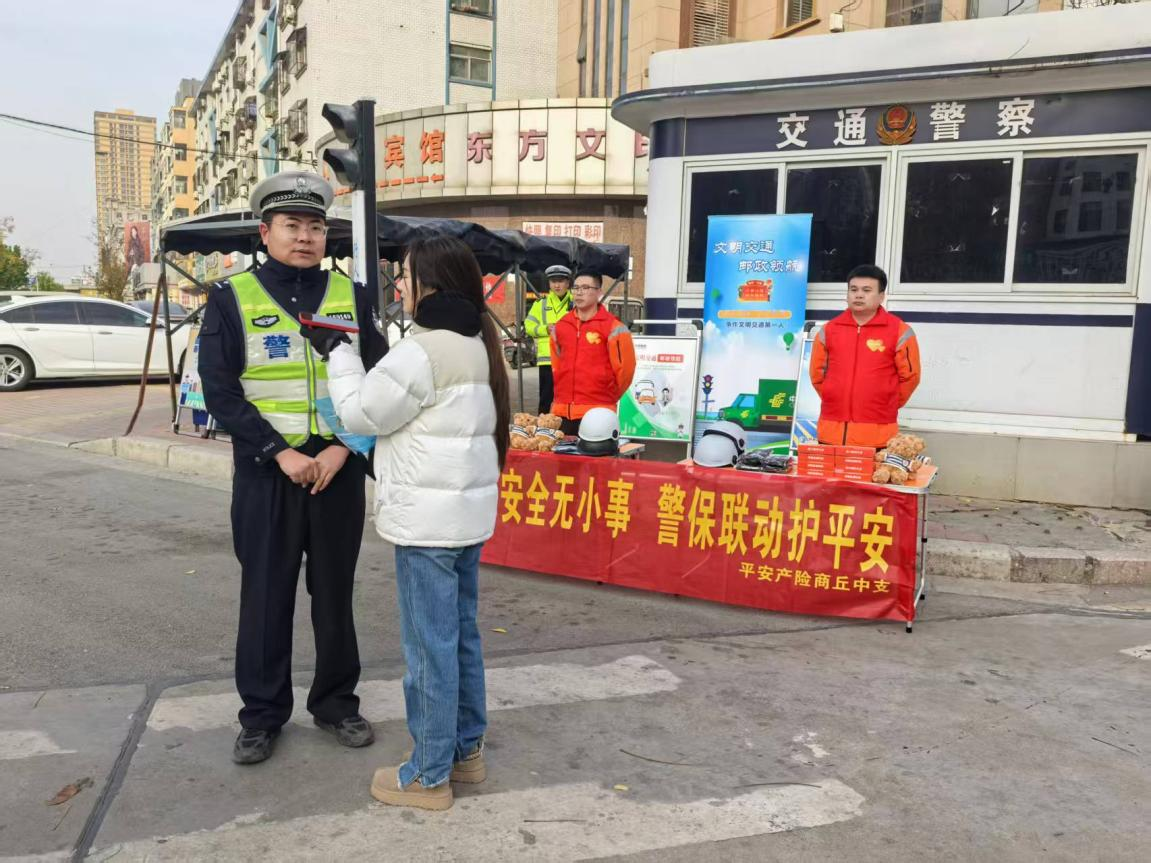 活动现场,警保联动,携手共建。商丘交警一大队的民警们结合冬季出行特点与典型交通事故案例,向过往市民生动讲解了安全行车、规范骑乘、行人注意事项等关键知识,强调了“一盔一带”的重要性,以及杜绝酒驾、超速、疲劳驾驶等违法行为的必要性。平安产险商丘中心支公司的志愿者们则从保险保障与风险预防的角度,向市民普及了车险知识、事故快速处理流程以及如何利用保险工具有效转移和化解出行风险,增强了大家的风险管理能力。